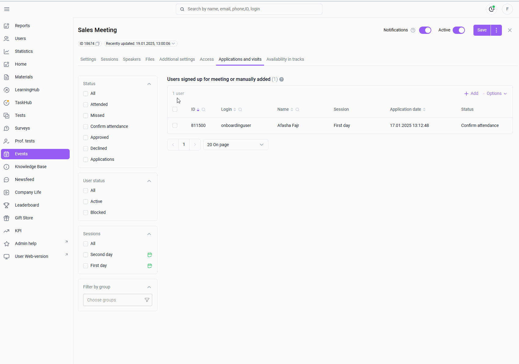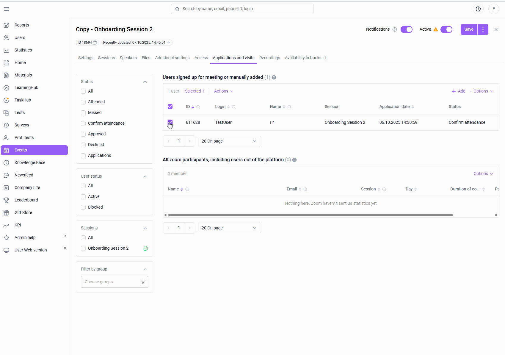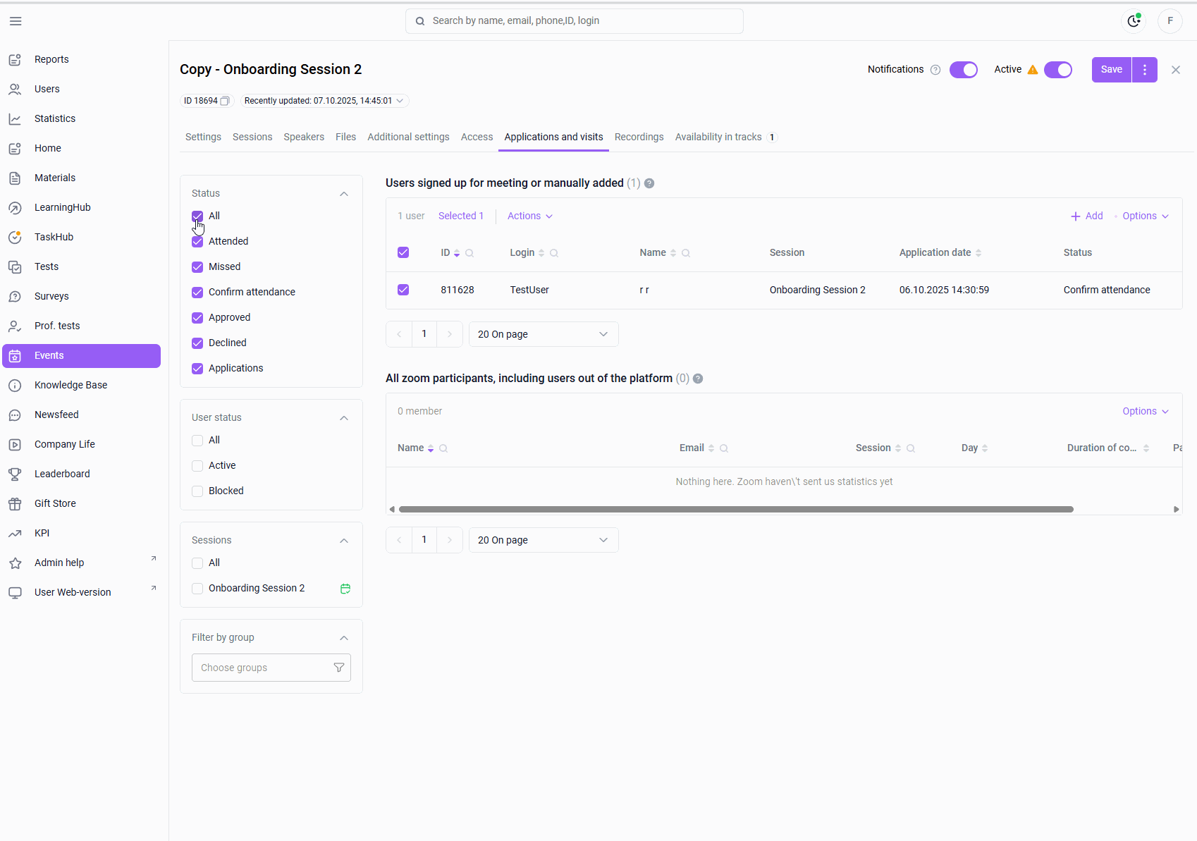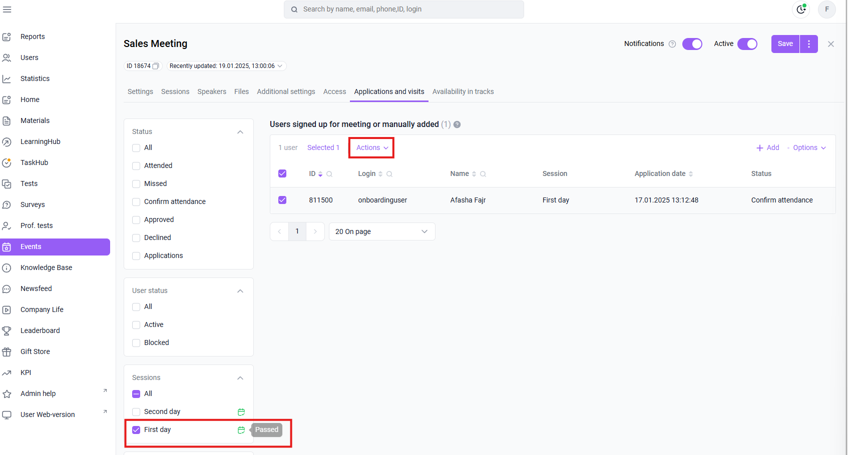 "Applications and Visits" tab > select a filter by sessions and mark a session (only one) > respond to user requests using checkboxes > actions > change the status of days > select days > specify the status (Participated or Missed) > the selected status will be set in the specified days for all selected applications.