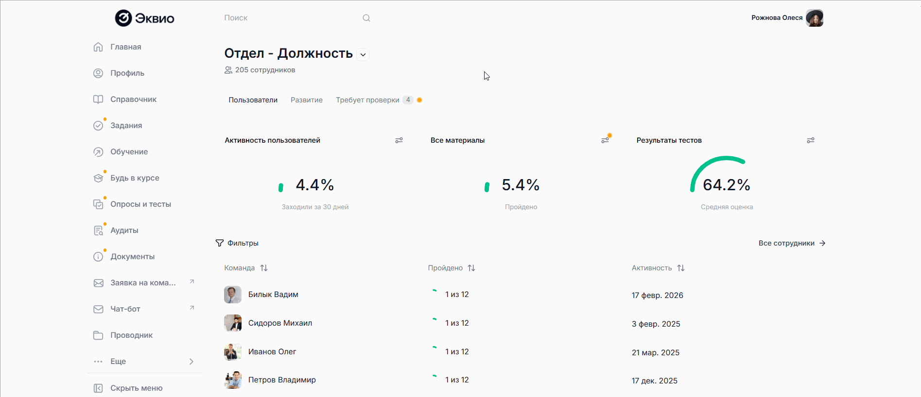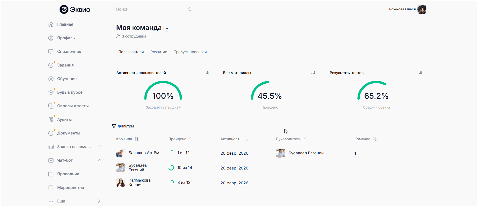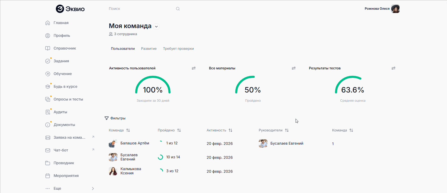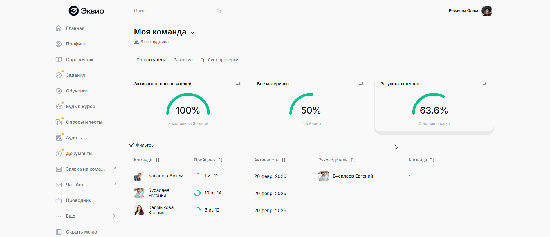 В разделе Моя команда в подразделе Пользователи руководитель может наблюдать за динамикой обучения подчиненных с помощью обобщенных круговых диаграмм, а также детализировано по каждому пользователю при переходе в его профиль.