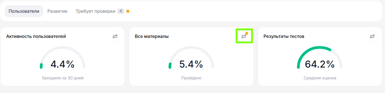При этом фильтры, выбранные для одного пользователя, автоматически будут применены ко всей команде. При возвращении на вкладку Пользователи в разделе Моя команда статистика по материалам согласно выбранных фильтров будет обновлена для всех пользователей.