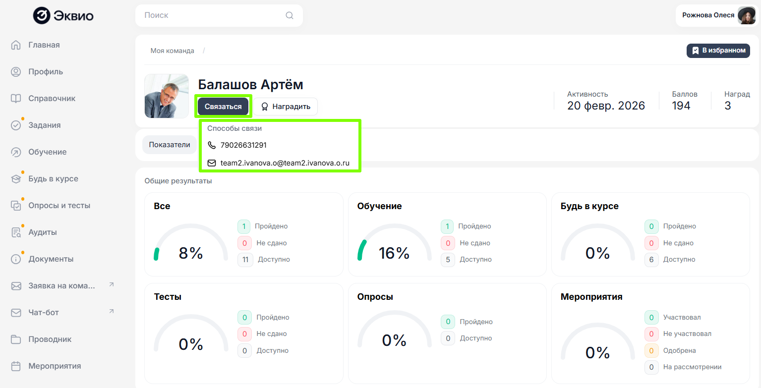 Как из раздела Моя команда руководитель может связаться с подчиненным
