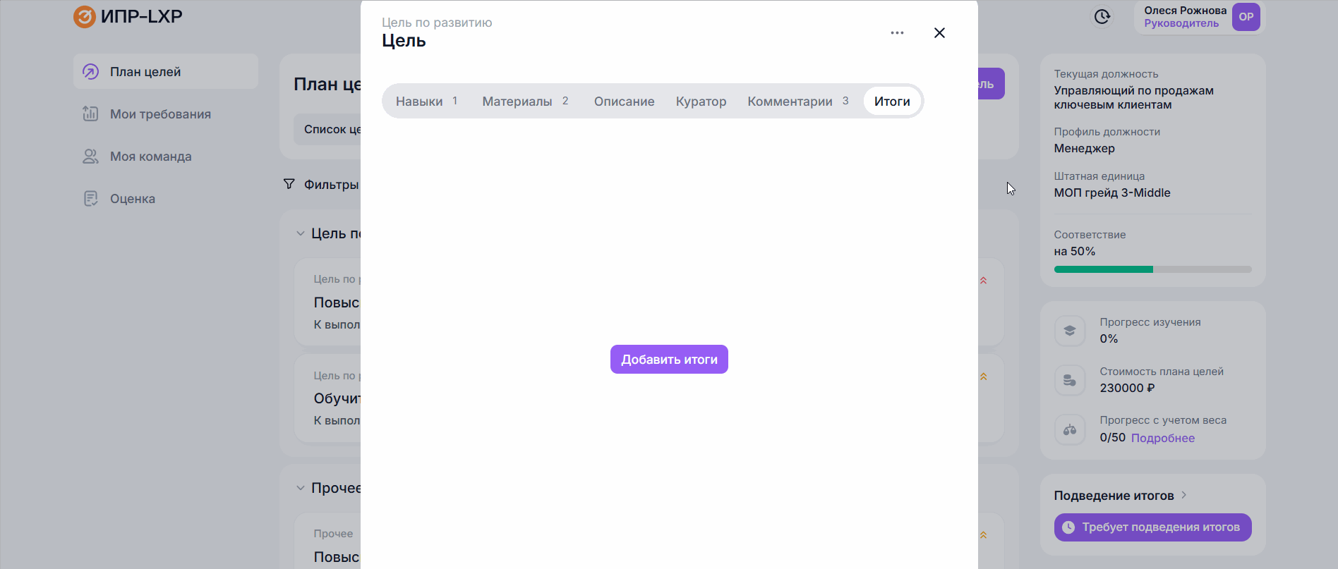 - В разделе План целей перейдите на вкладку Итоги над списком целей в ИПР ;