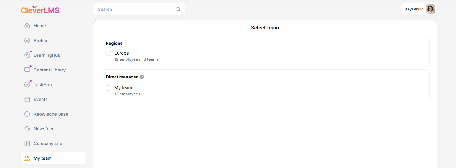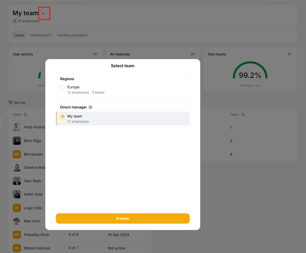 Select the "Selected Team" button. Clicking it opens a group selection window. > Select a group. If the group is not nested, the team's data is displayed immediately. If the group is nested, the manager can drill down to the subgroups below. > After selecting a team, all data on the tabs will display its results.