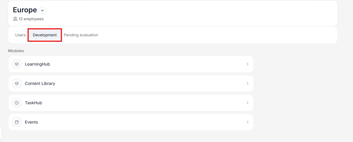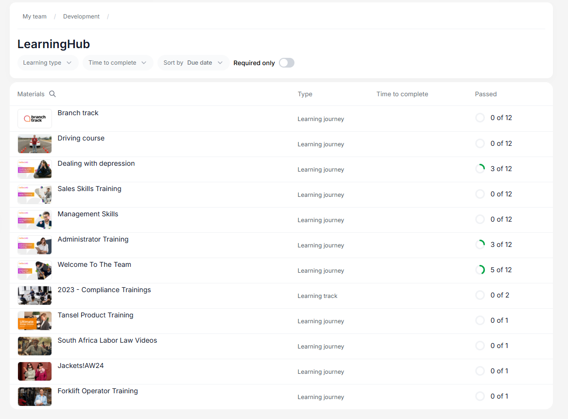 When navigating to each section within Training, managers can view the entire list of materials available to their subordinates within the selected section or use filters. Filters and sorting options vary depending on the specifics of the section.