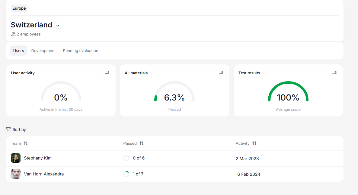 In the "My Team" section , in the "Users" subsection, a manager can monitor the dynamics of their subordinates' training using generalized pie charts, as well as detailed information for each user when going to their profile.