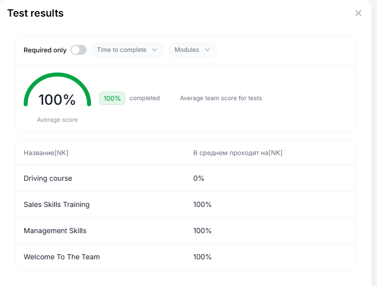 The team result is displayed using three widgets: User activity, All materials, Test results. Moreover, each of them has its own set of filters and sortings, available by clicking on settings (gear in the lower right corner) or the filters icon on the web version.