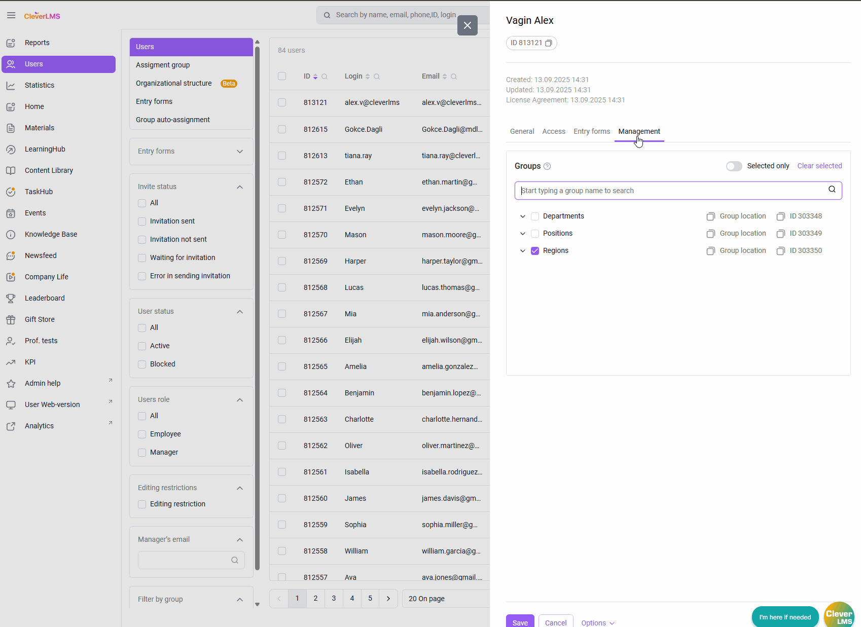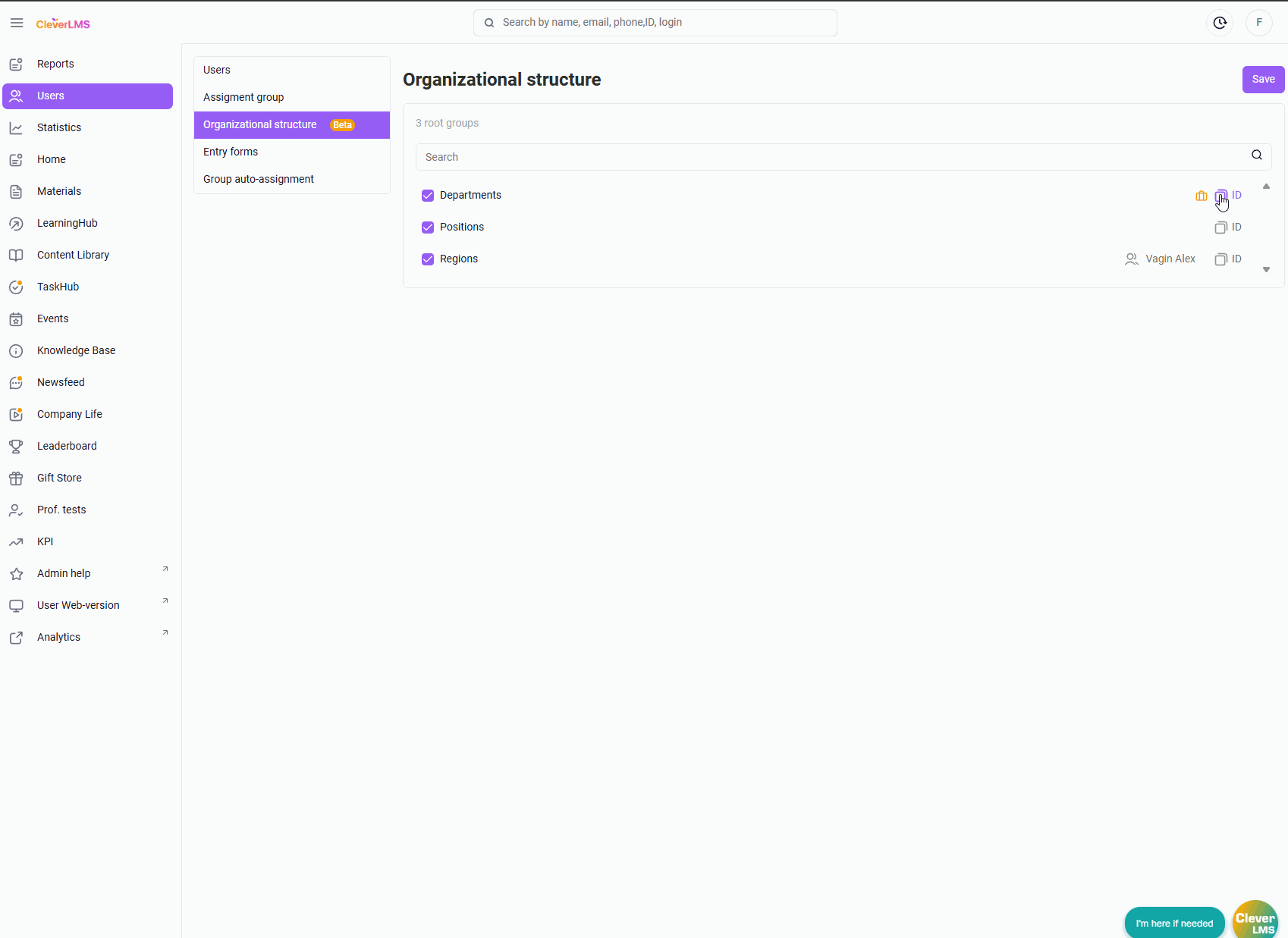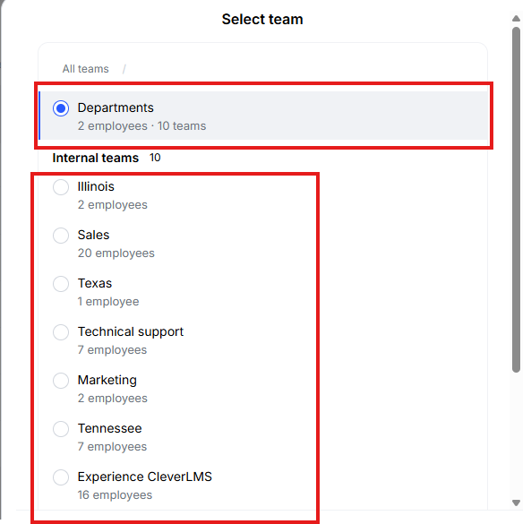 In the group settings for the desired hierarchy level, the administrator sets the specified employee to be the manager of this group. This manager sees the My Team section, where all users in this group are located, and can also view statistics for teams lower in the group hierarchy.