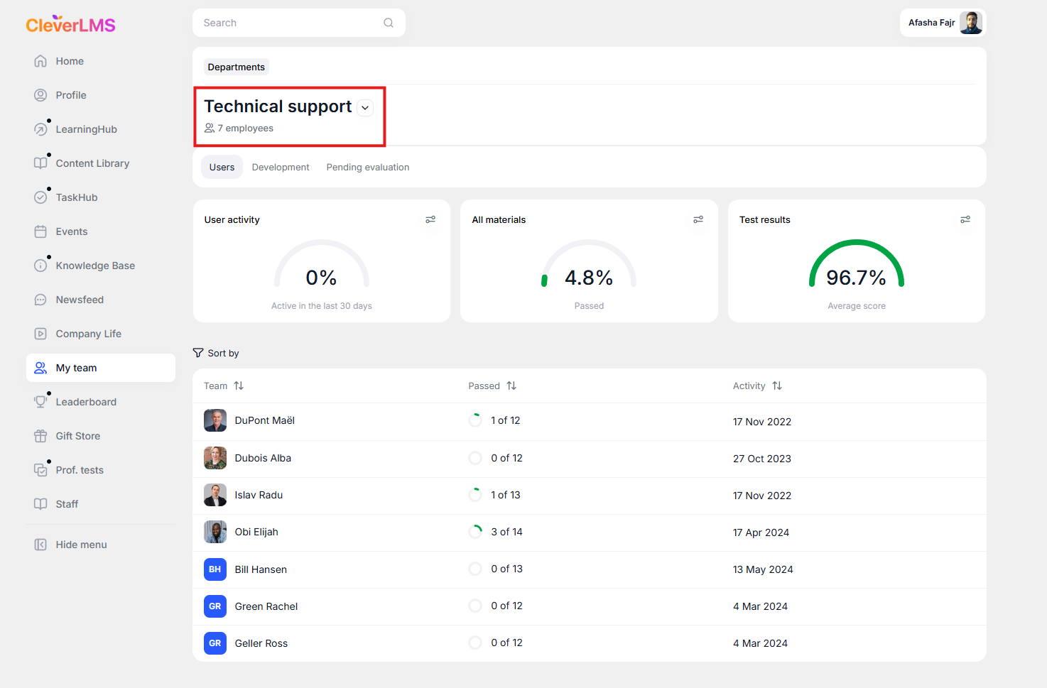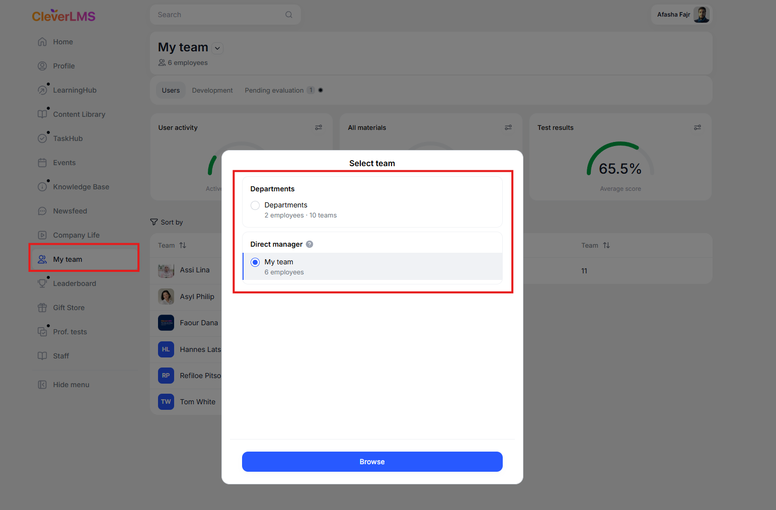 The manager selects a team and can view the users' results .