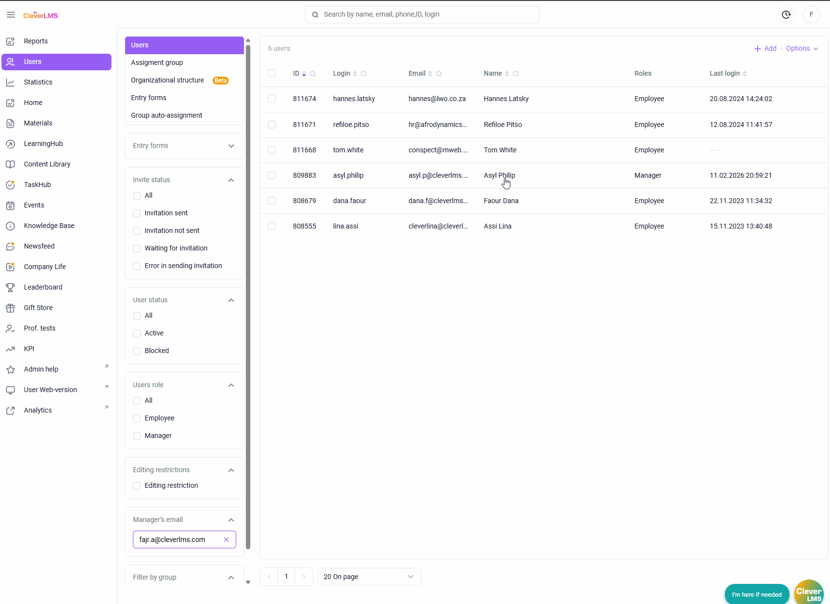 - Select managers using checkboxes (you can search for managers by full name, email, phone number, or login);