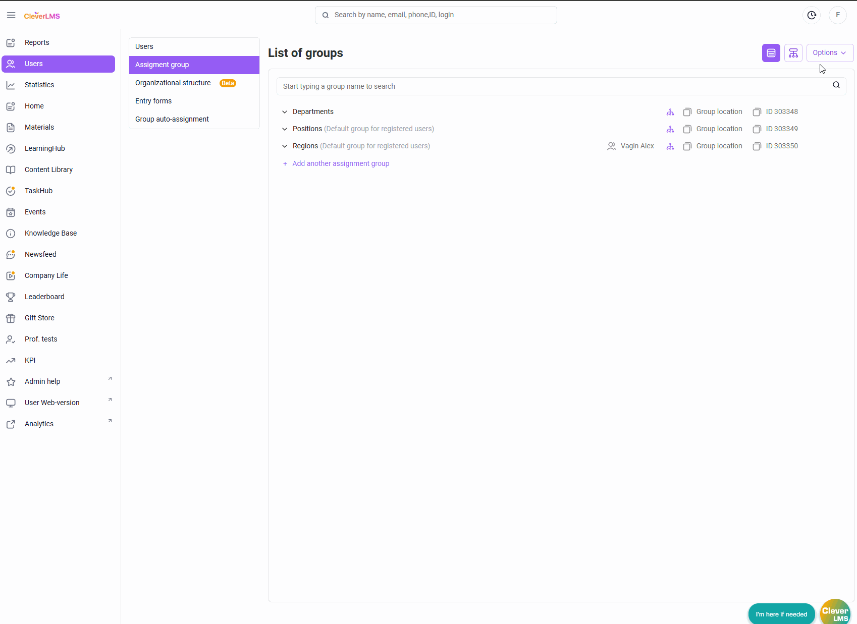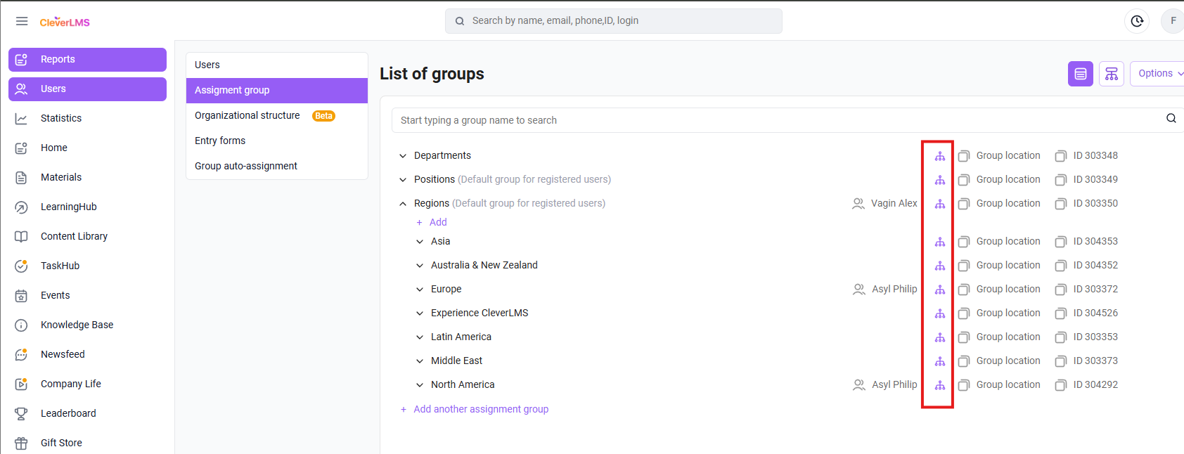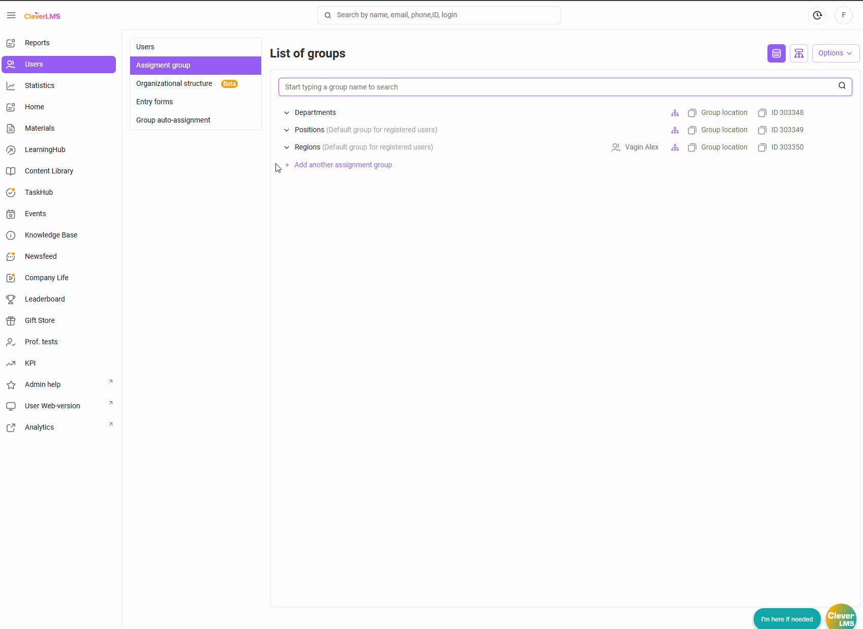 The assignment is performed in the section “Users → Assignment groups” .