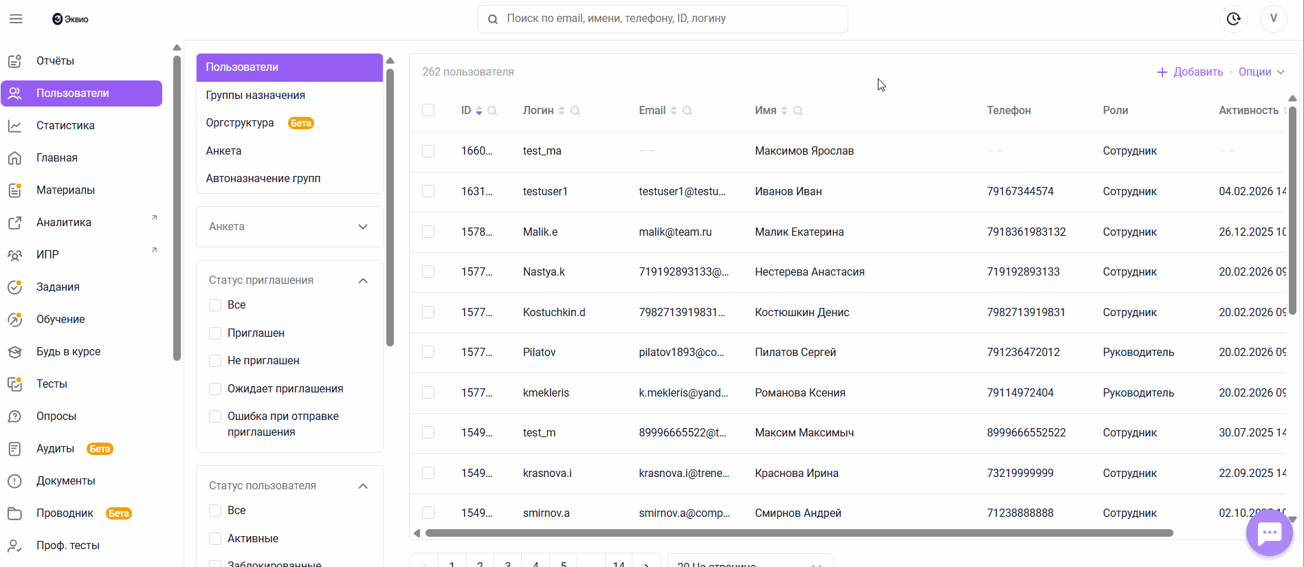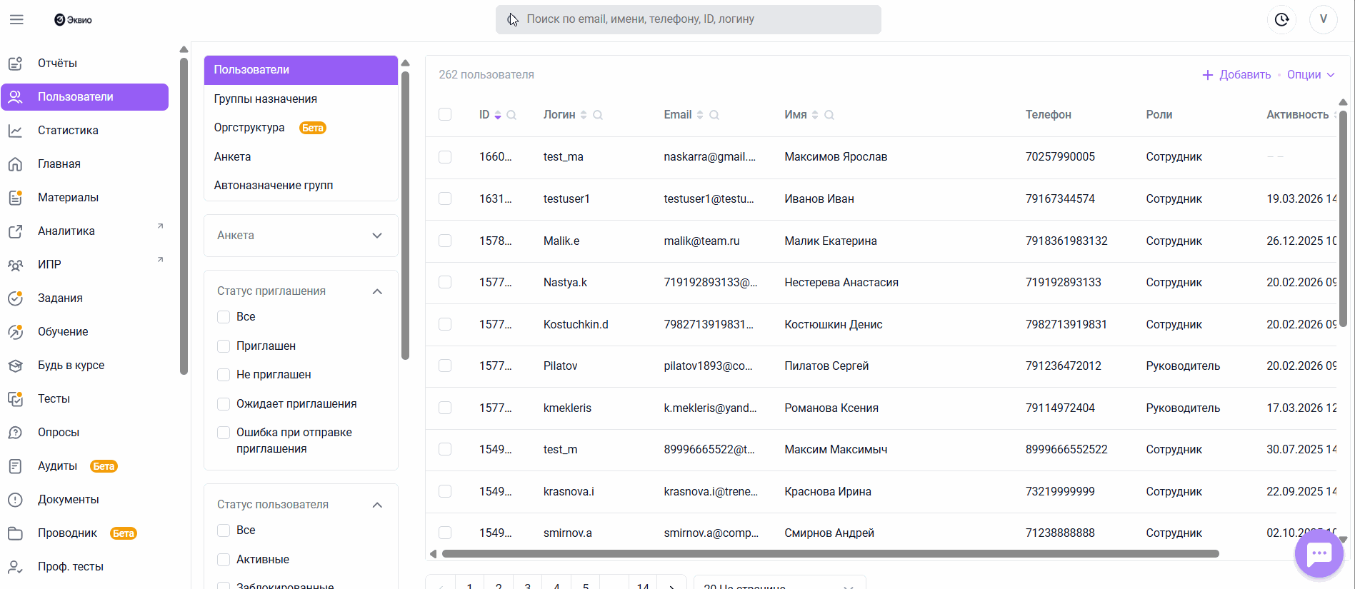 • Блокировать - ограничить доступ пользователю к платформе.