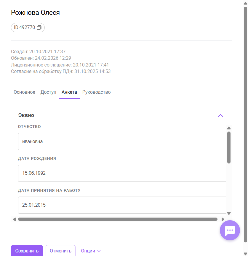 Вы можете изменять / добавлять / удалять необходимые данные. Формат заполнения полей карточки пользователя см. в статье Создание пользователя.