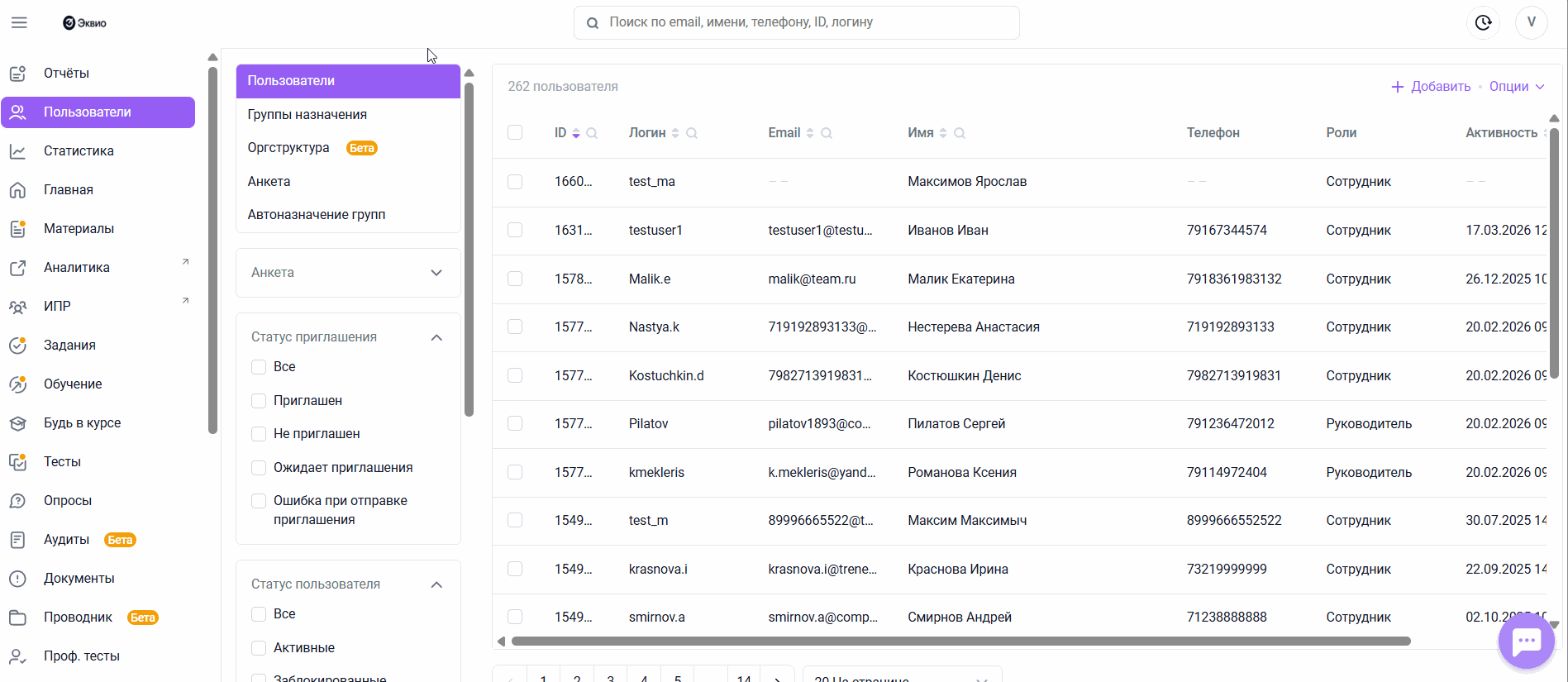 Пользователи будут добавлены в систему в соответствии с данными, указанными для генерации. ID и пароль пользователей будут сгенерированы.