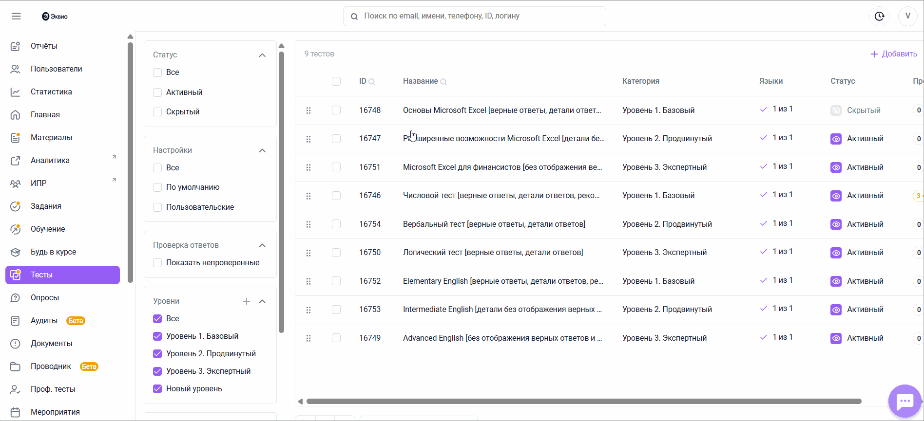 - Перейдите в раздел Тесты и выберите интересующий вас тест;