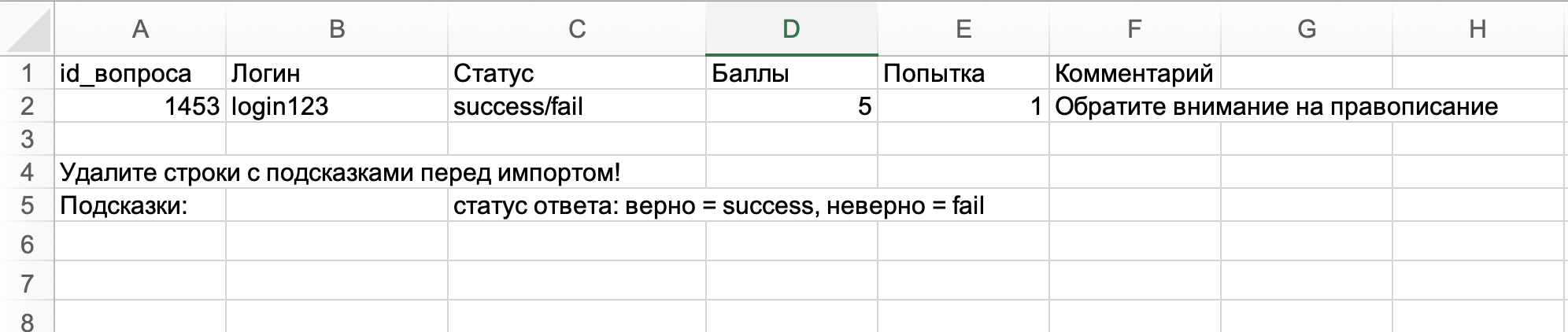 Обязательными для заполнения являются поля: "id_вопроса", "Логин", "Статус". Поле "Баллы" обязательно для статусов верно и неверно.