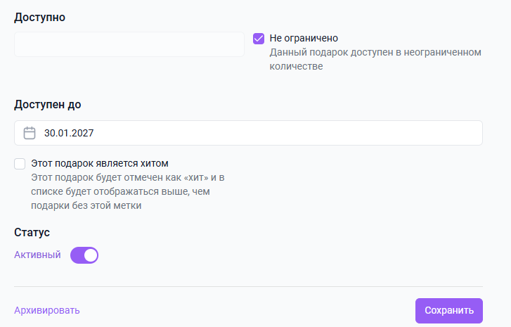Укажите дату в поле Доступен до: после наступления этой даты подарок автоматически перейдет в статус Скрытый и станет недоступным для пользователей (дата не может быть в прошлом).