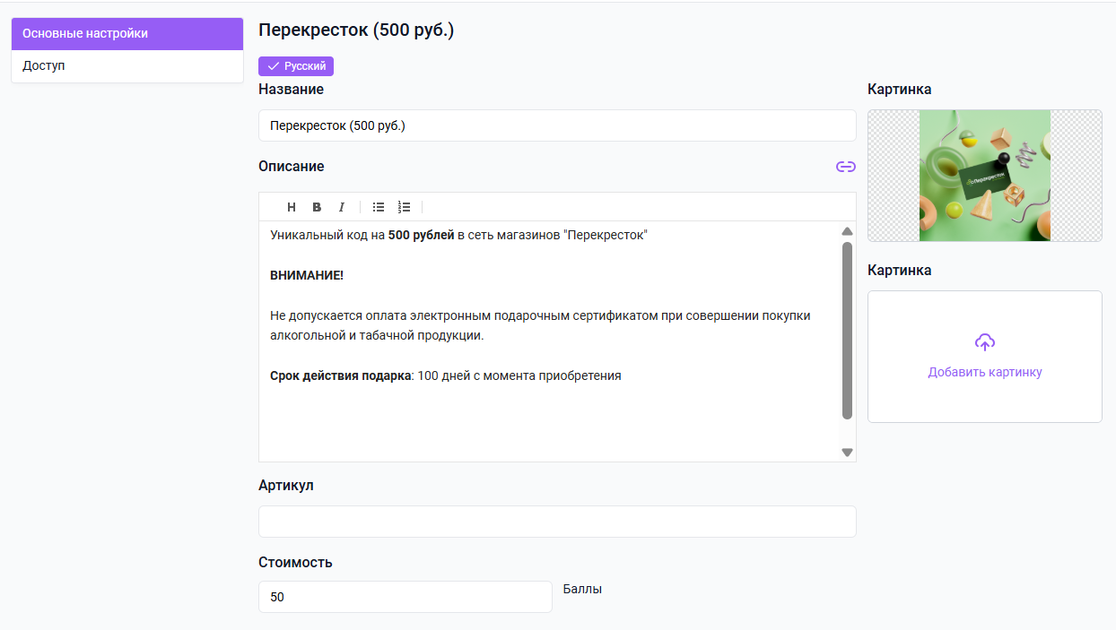 Укажите Стоимость подарка в баллах (должно быть целым положительным числом);
