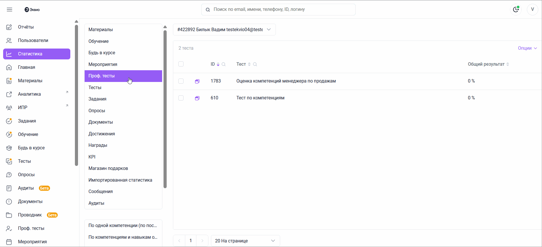 Чтобы выгрузить статистику по по компетенциям одного пользователя (по всем тестам) раздела Проф. тесты: