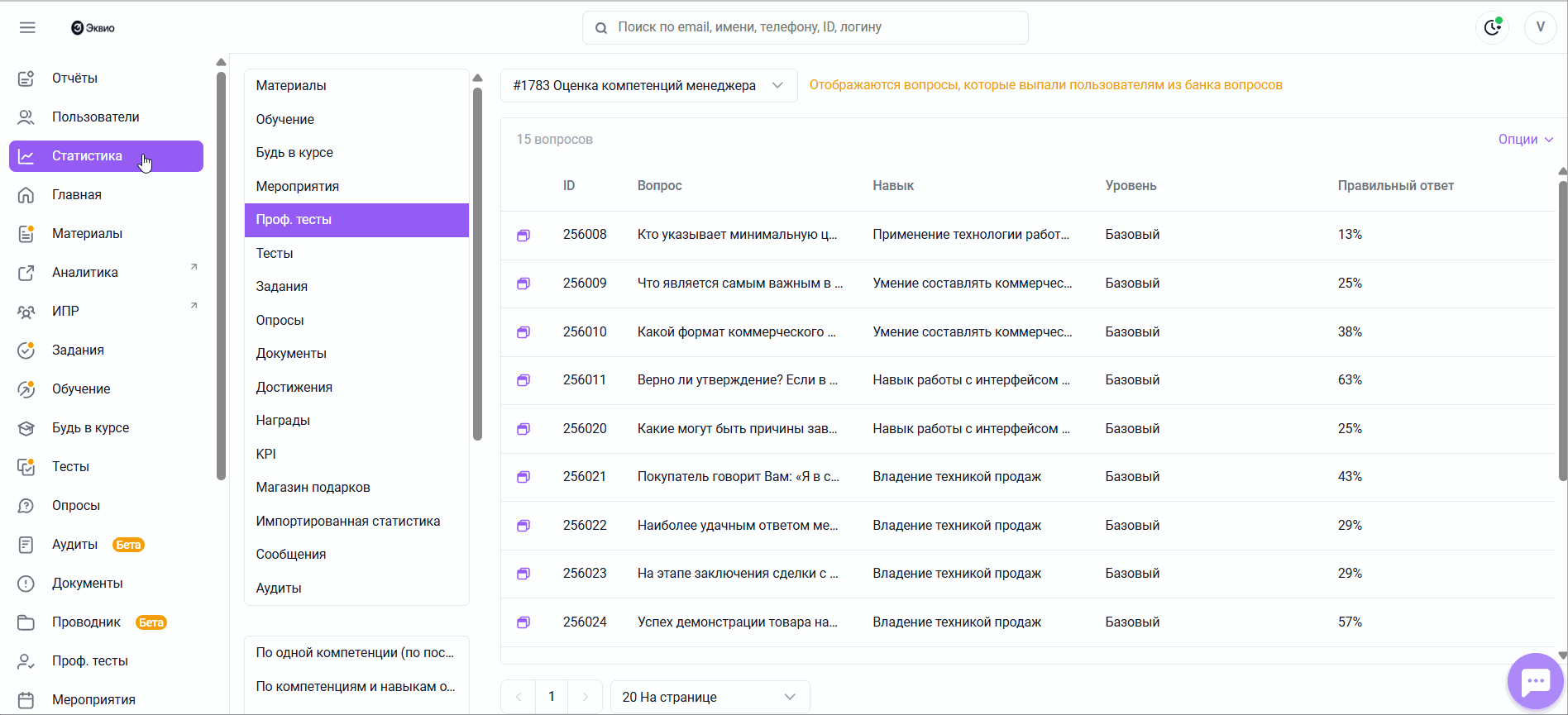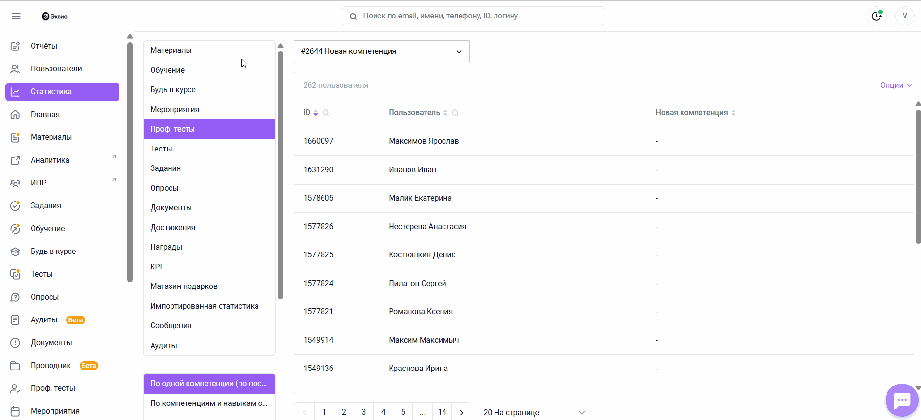 Как выгрузить статистику по одной компетенции Проф. теста
