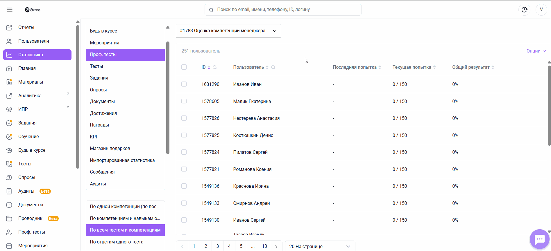 Как выгрузить статистику по всем тестам и компетенциям Проф. теста