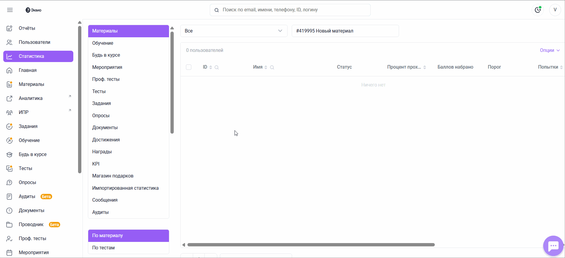 В области дополнительной навигации вы можете фильтровать пользователей по статусу, материалы - по доступу (индивидуальный, по группам).