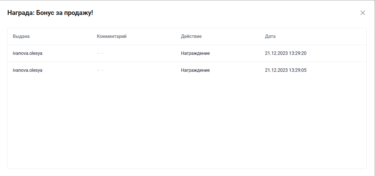 - Выдана - логин администратора/менеджера, выдавшего награду,