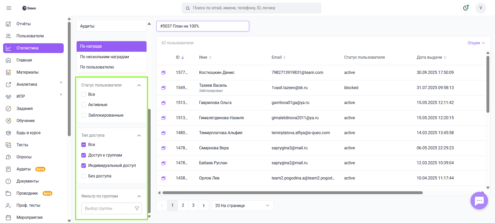 В административной панели в области дополнительной навигации вы можете фильтровать пользователей по статусу, типу доступа к награде, а также в зависимости от определенной группы, к которой принадлежит пользователь.