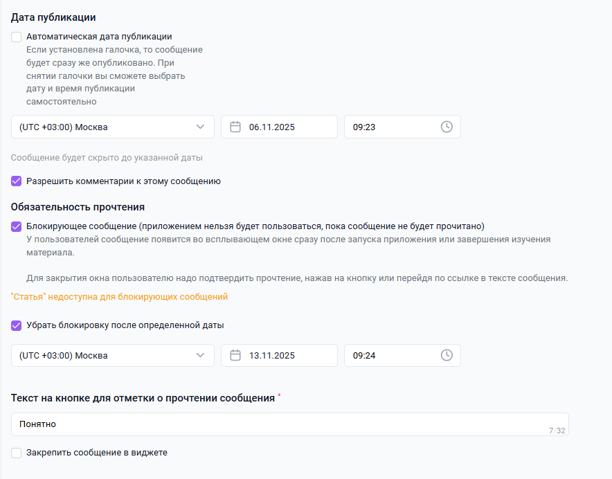 Поля даты и времени являются обязательными для заполнения при установленном чек боксе "Убрать блокировку после определенной даты". По наступлению указанной даты и времени чек бокс "Обязательность прочтения" у сообщения автоматически снимается.
