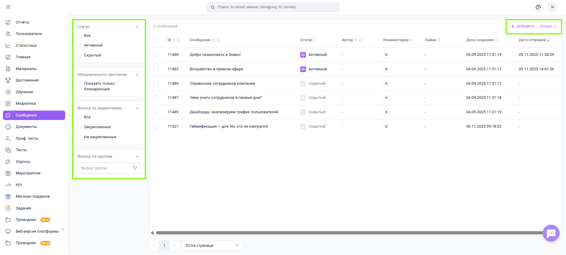 При открытии раздела вы попадаете на экран с фильтрами и списком ранее созданных сообщений.