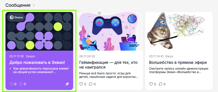 Закрепить сообщение в виджете - позволяет выделить сообщение цветом и расположить выше на главной страницы в виджете" Сообщения".