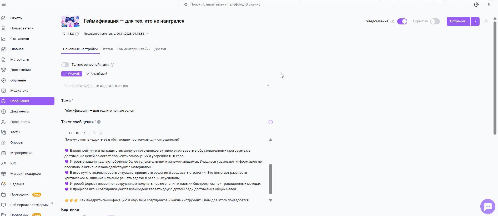 Примечание. Тумблер статуса активируется после заполнения всех настроек сообщения. Если в компании включено несколько языков, то необходимо заполнить все языки. Переключение доступных языков контента расположено в верхней части формы.