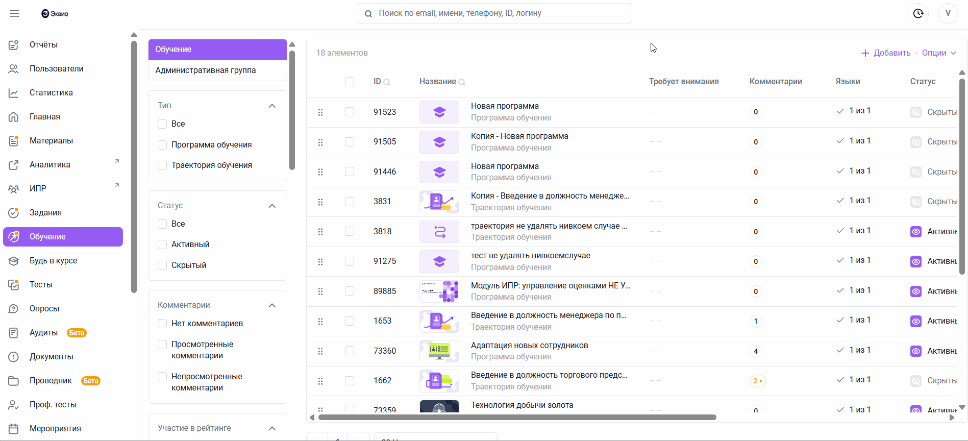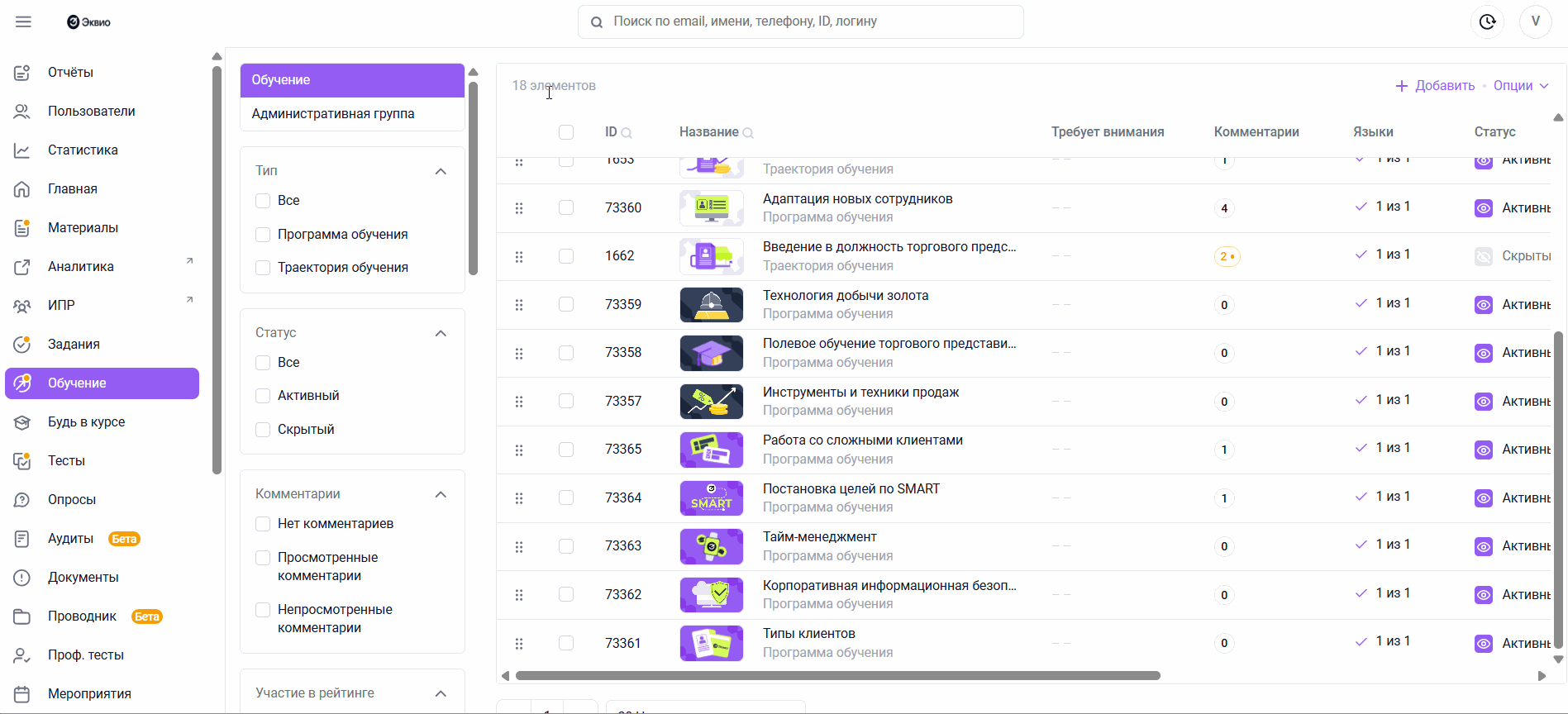 На вкладке Комментарии в программе обучения отображаются комментарии, которые оставили пользователи при ее прохождении.