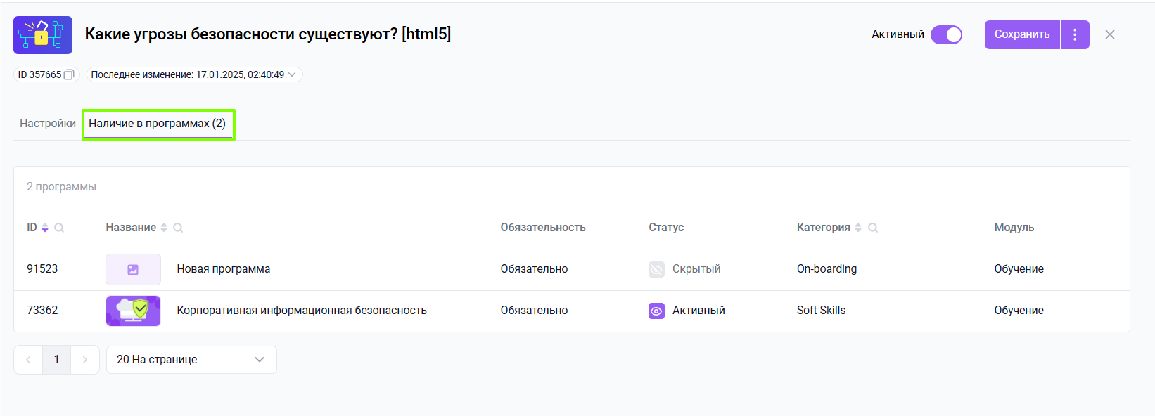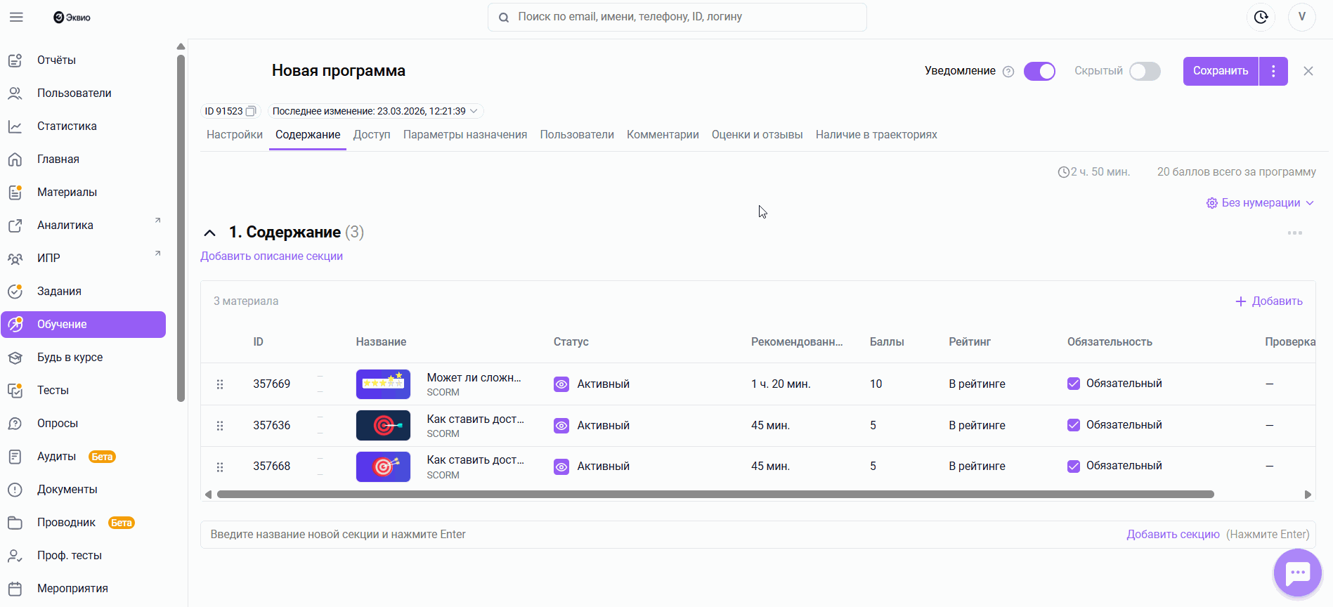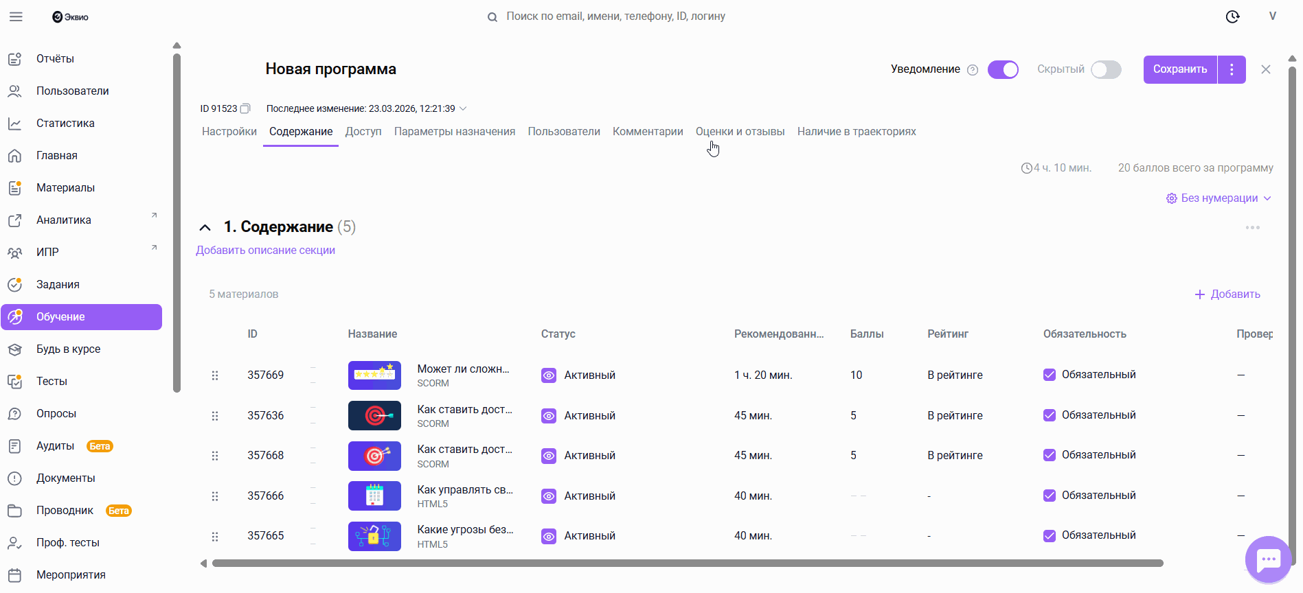 - Переведите программу обучения в статус Скрыто;
