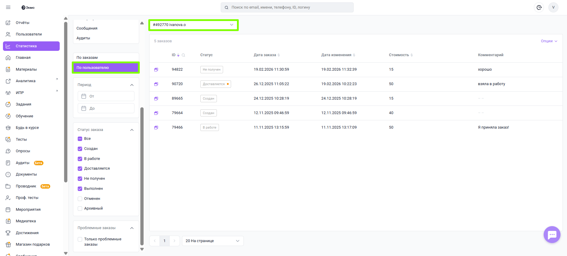 Статистика по разделу Магазин подарков позволяет отслеживать данные по заказам пользователей, их статусам, дате оформления, стоимости и другим параметрам. Также предусмотрена возможность просмотра информации по конкретным пользователям.