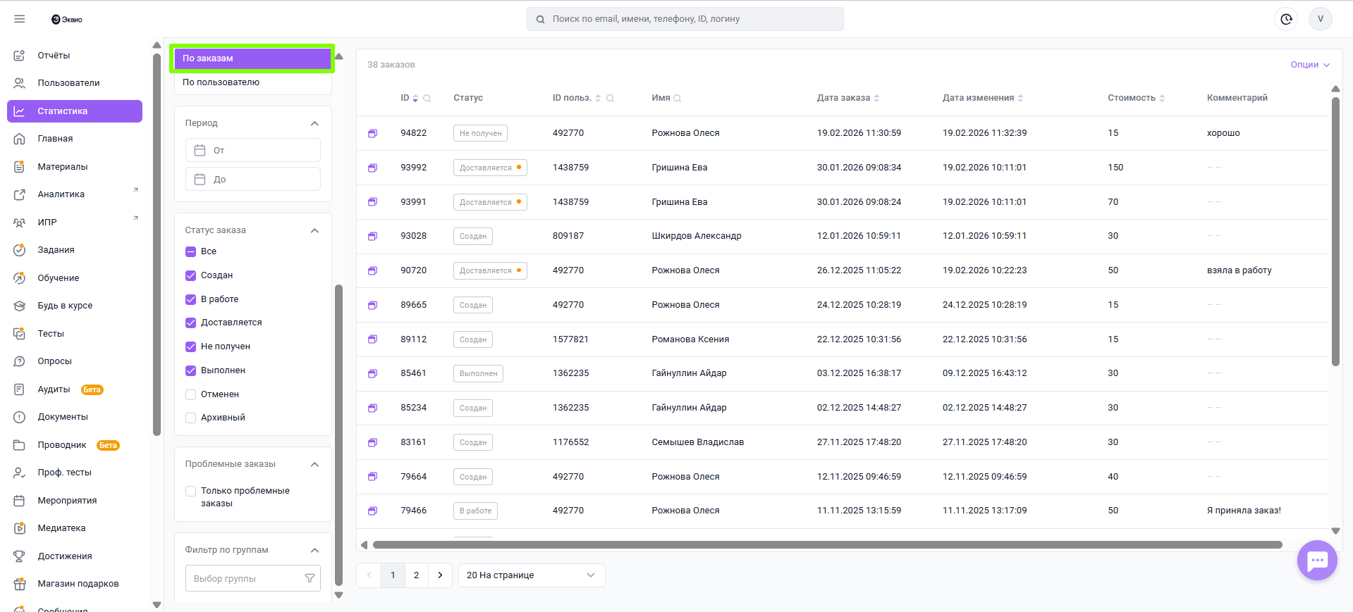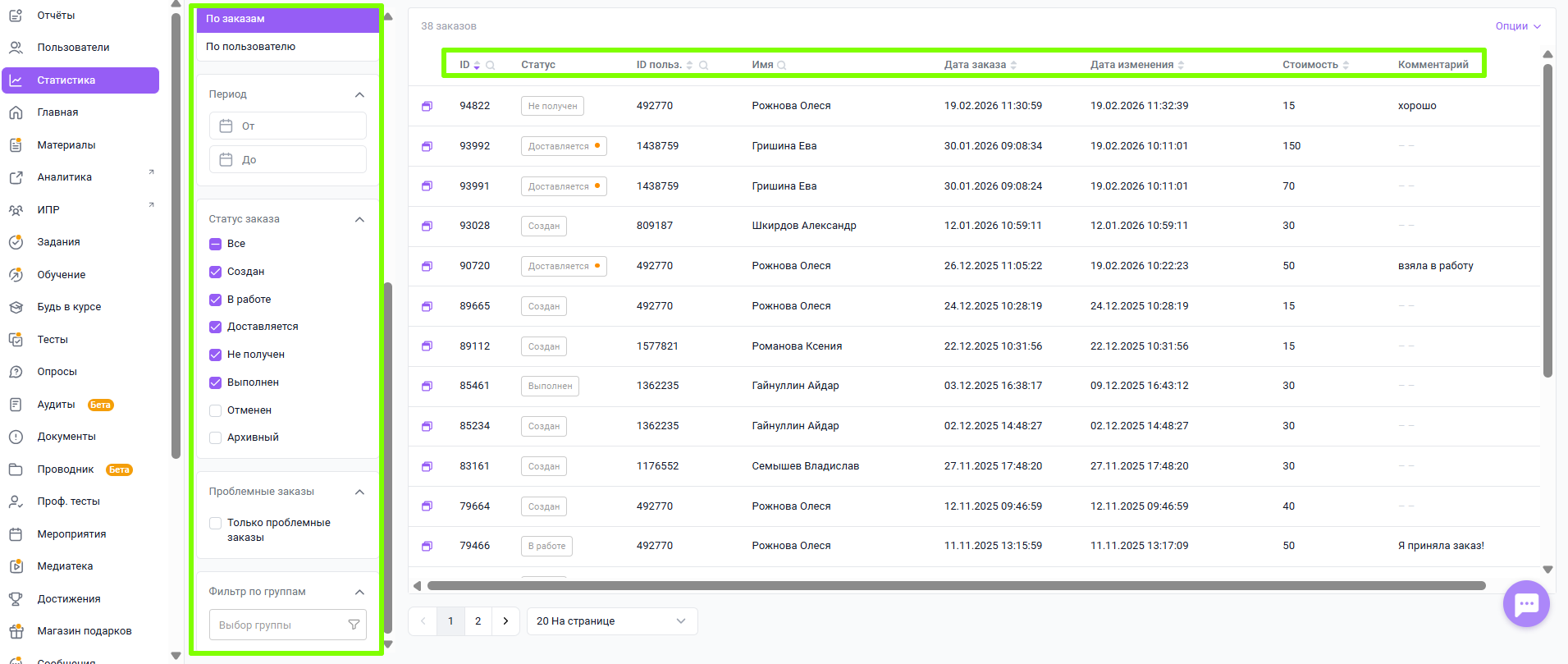 Фильтр по группам позволяет отображать заказы пользователей, входящих в выбранную группу. После выбора группы в основной таблице будут отображаться только соответствующие заказы.