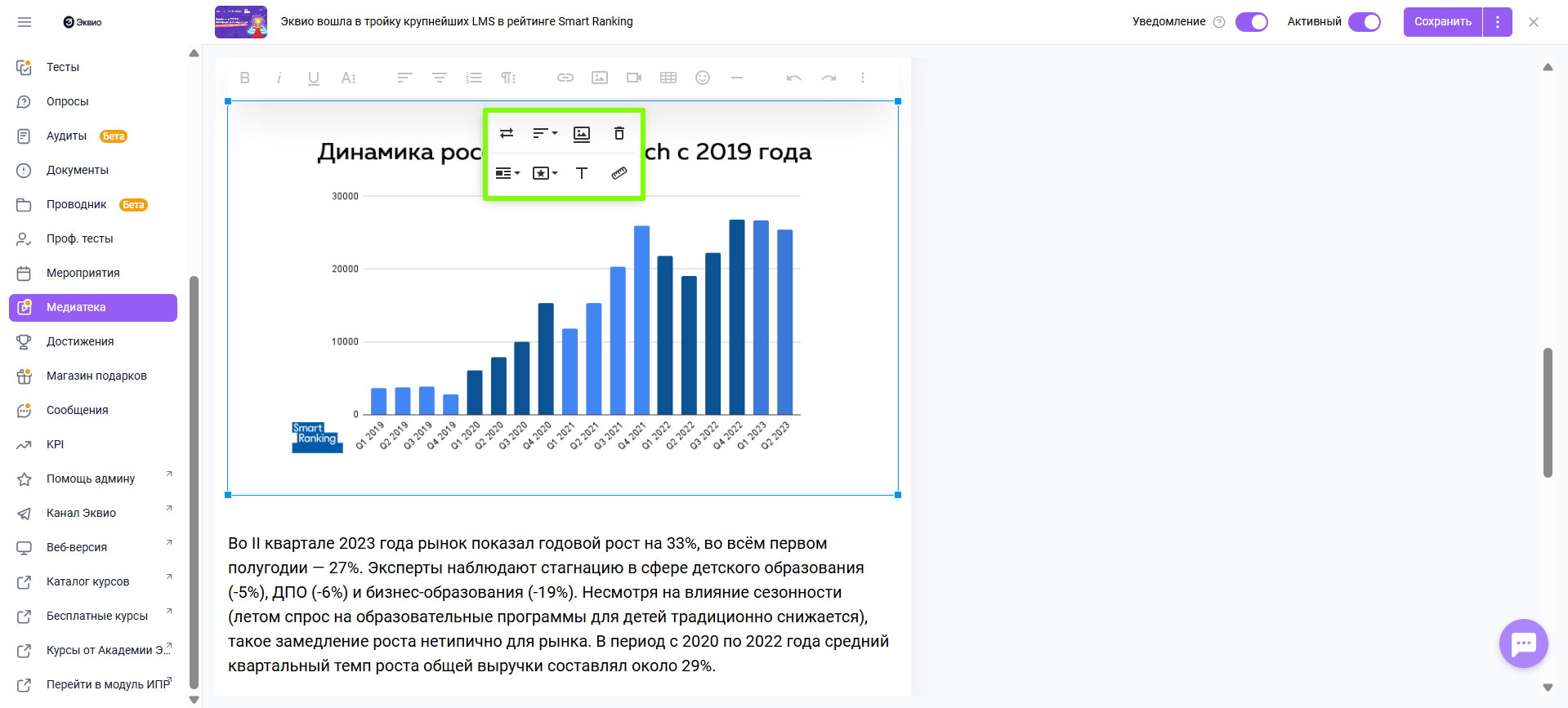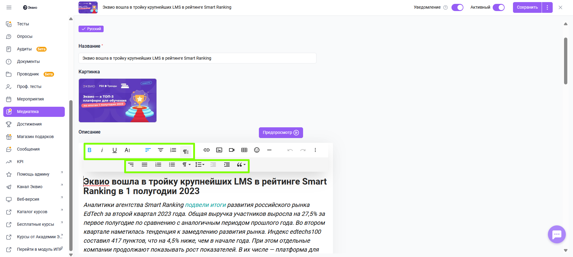 - Добавление и редактирование элементов в статье материала Медиатеки
