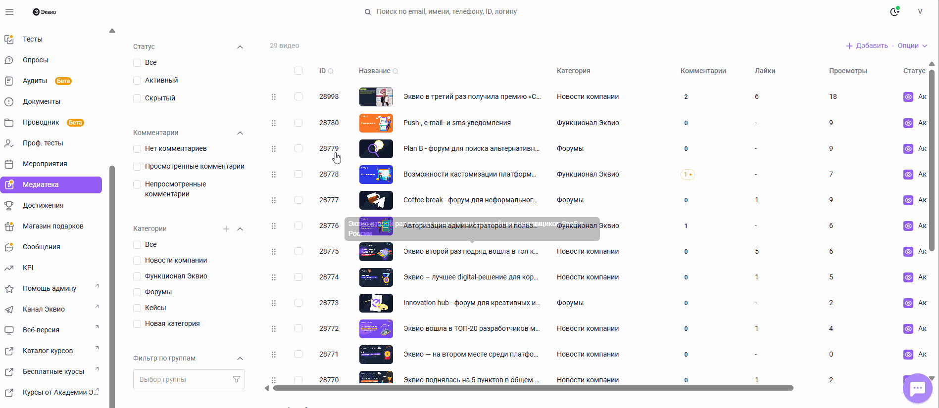 Статус показывает доступность видеоролика в платформе - виден он пользователю или нет. Имеет два значения Скрытый или Активный.