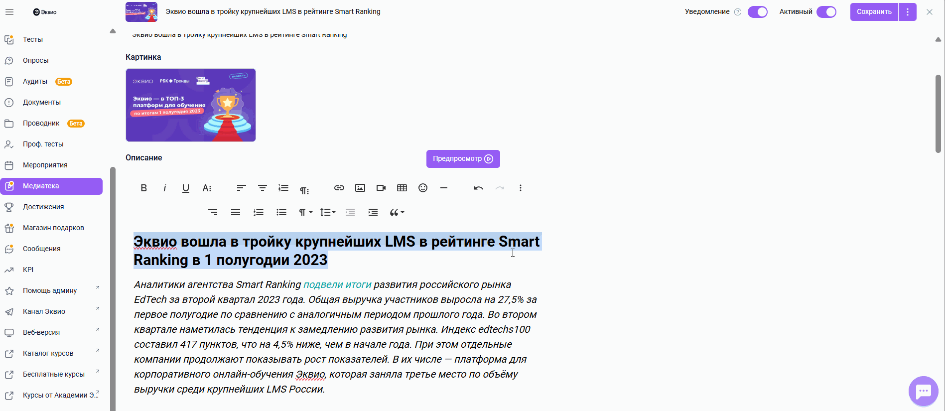 Создание статьи в материале Медиатеки