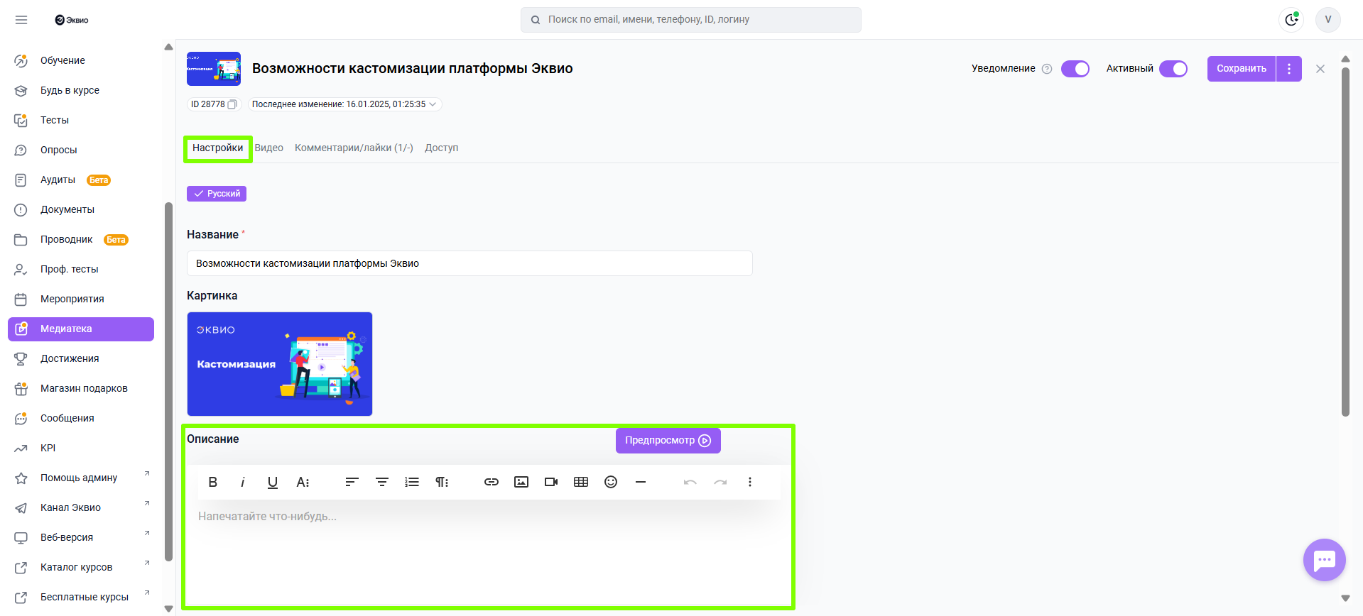 Создание и редактирование развернутого наполнения материала в разделе Медиатеки в виде статьи осуществляется на вкладке Настройки.