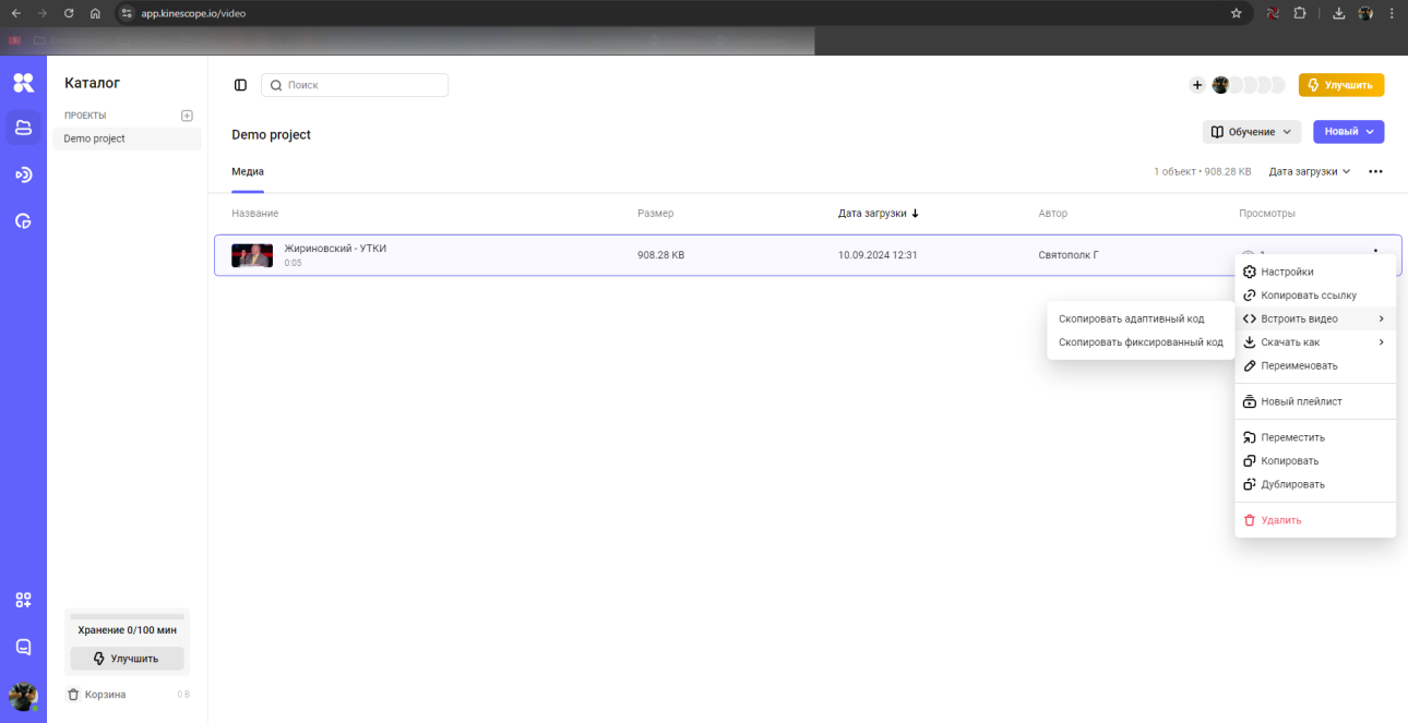 https://kinescope.io/ с помощью html-кода (скопировать фиксированный код).