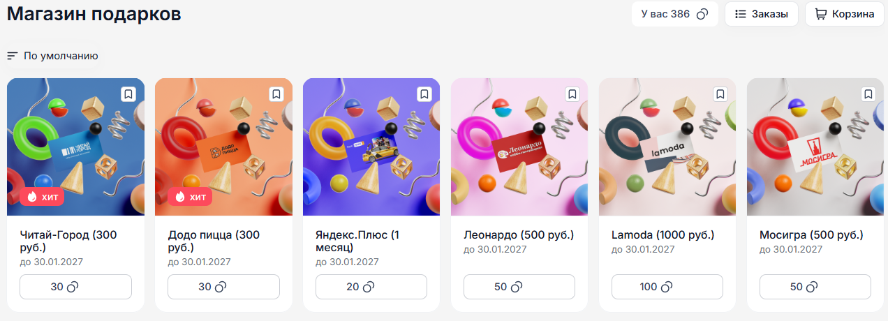 Магазин подарков превращает накопленные баллы в реальные и полезные вознаграждения для пользователей. Разнообразие подарков — от электронных сертификатов и обучающих курсов до корпоративного мерча — позволяет удовлетворить интересы сотрудников и повышает мотивацию.