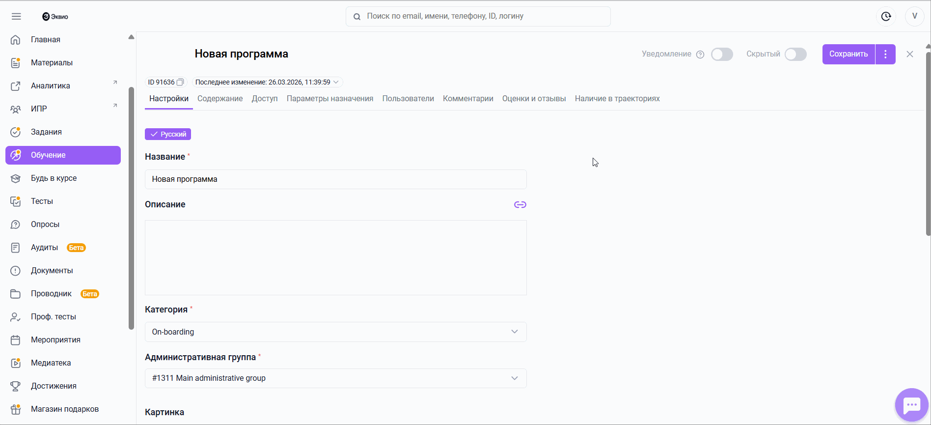 Администратор может управлять отправкой уведомлений с помощью переключателя (свитча), который доступен в карточке материала. Управление возможно в любом статусе материала: Скрытый или Активный.