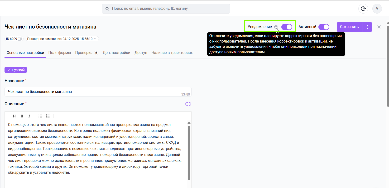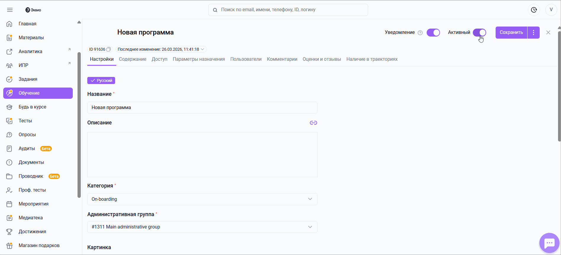 Активен | Включение при активном материале | уведомления будут отправлены только сотрудникам, получающим доступ к материалу позднее включения этой настройки |
