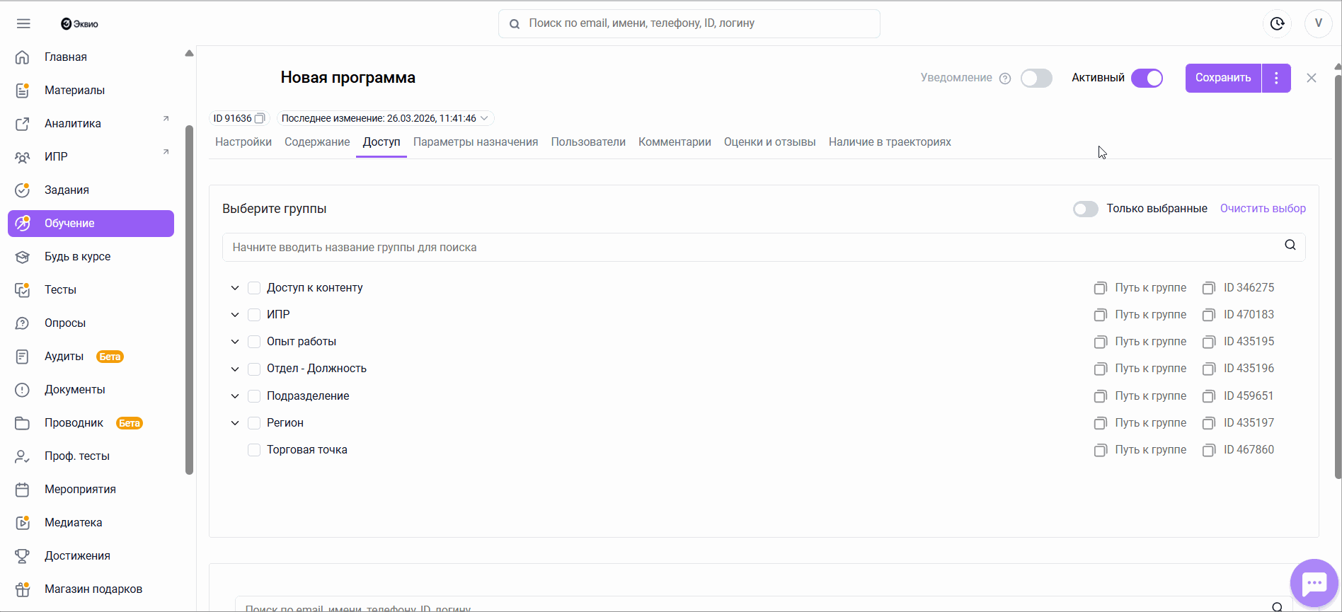 После активации материала при таких условиях можно в дальнейшем включить свитч Уведомлений, чтобы пользователи, получающие доступ к материалу в будущем, получали уведомления о назначении контента. При этом те, кто ранее уже получил доступ, уведомлений о назначении не получат.