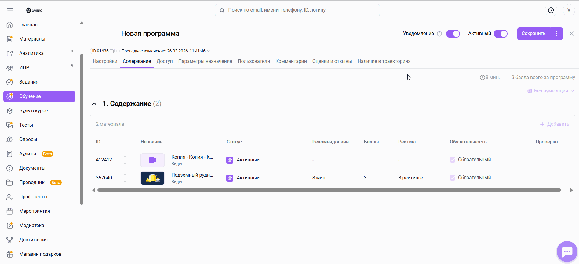 - Новые пользователи будут получать Push и/или Email-уведомления при назначении материала.