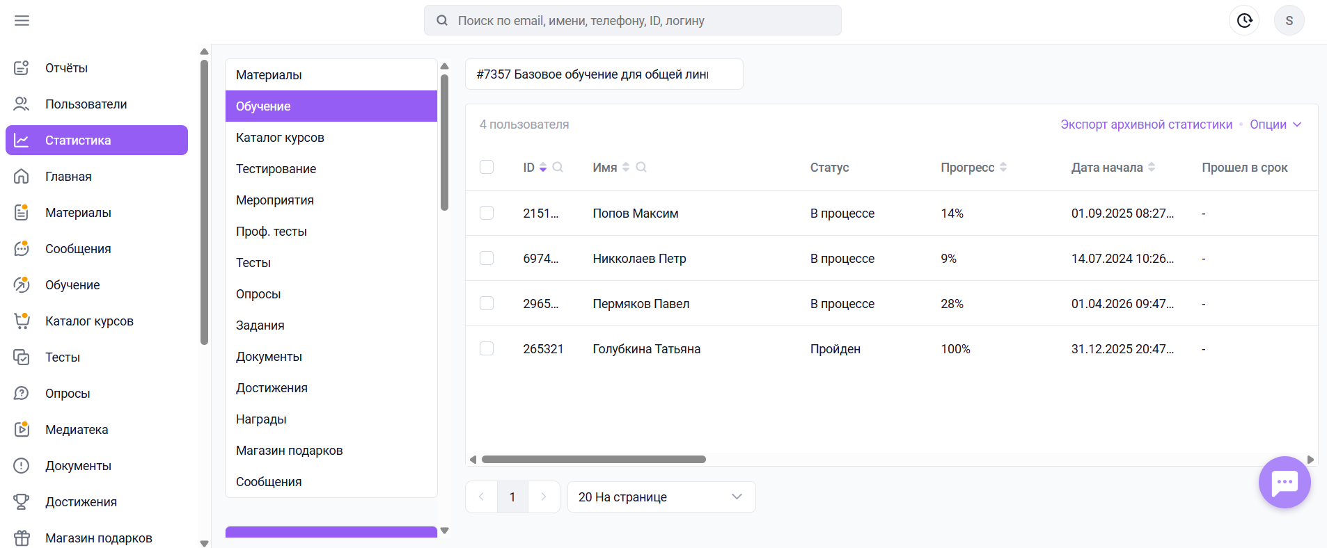 Через 24 часа после внесения изменений, описанных выше, статистика охлаждается. При формировании выгрузки по таким траекториям у главного администратора появляется Экспорт архивной статистики.