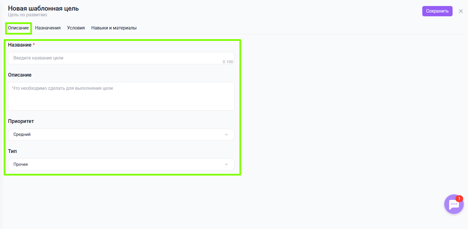 При выборе опции Создать ещё одну шаблонную цель форма для создания шаблонной цели будет открываться автоматически после каждой добавленной цели; - Заполнить значения на вкладке Описание;