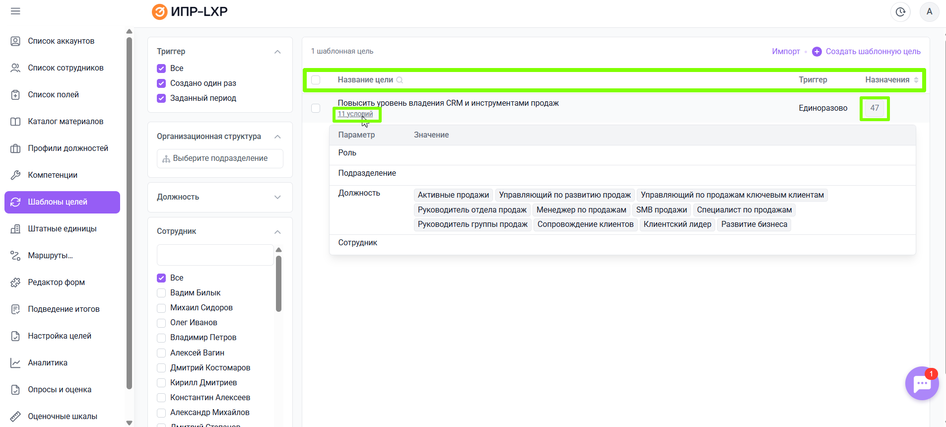 - Должность - цель будет назначена сотрудникам, занимающим выбранные должности;