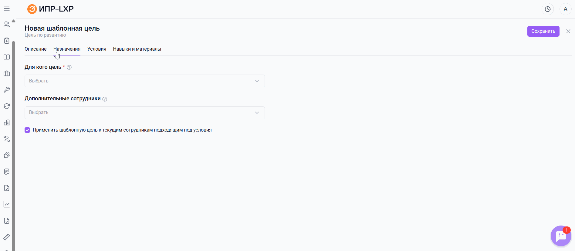 Если не выбирать данную функцию, то шаблонная цель будет добавлена только к новым сотрудникам, у которых ИПР будет создан после сохранения этой шаблонной цели.