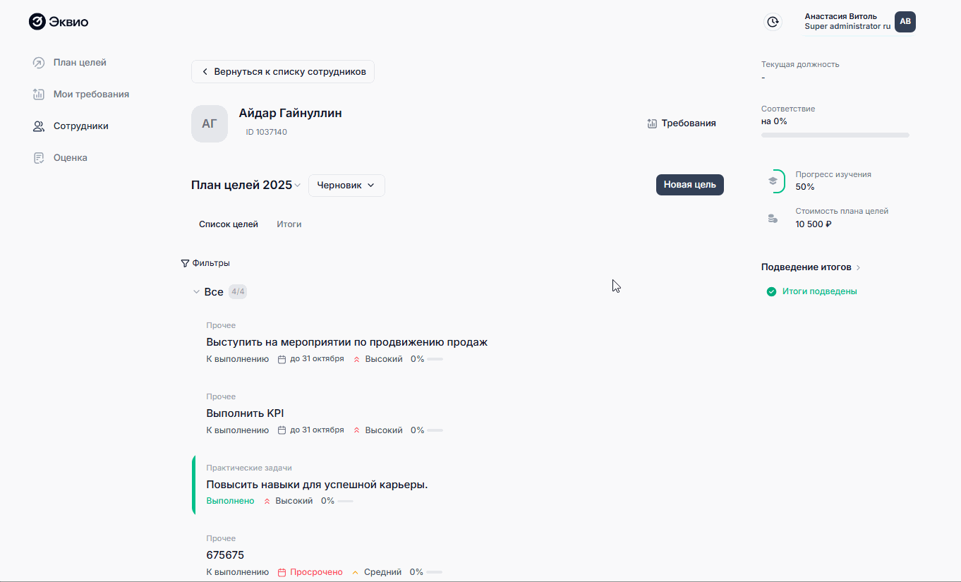 План целей - отображается информация о целях сотрудника в рамках ИПР. Здесь происходит создание и редактирование ИПР;
