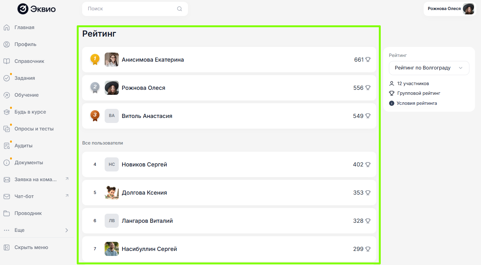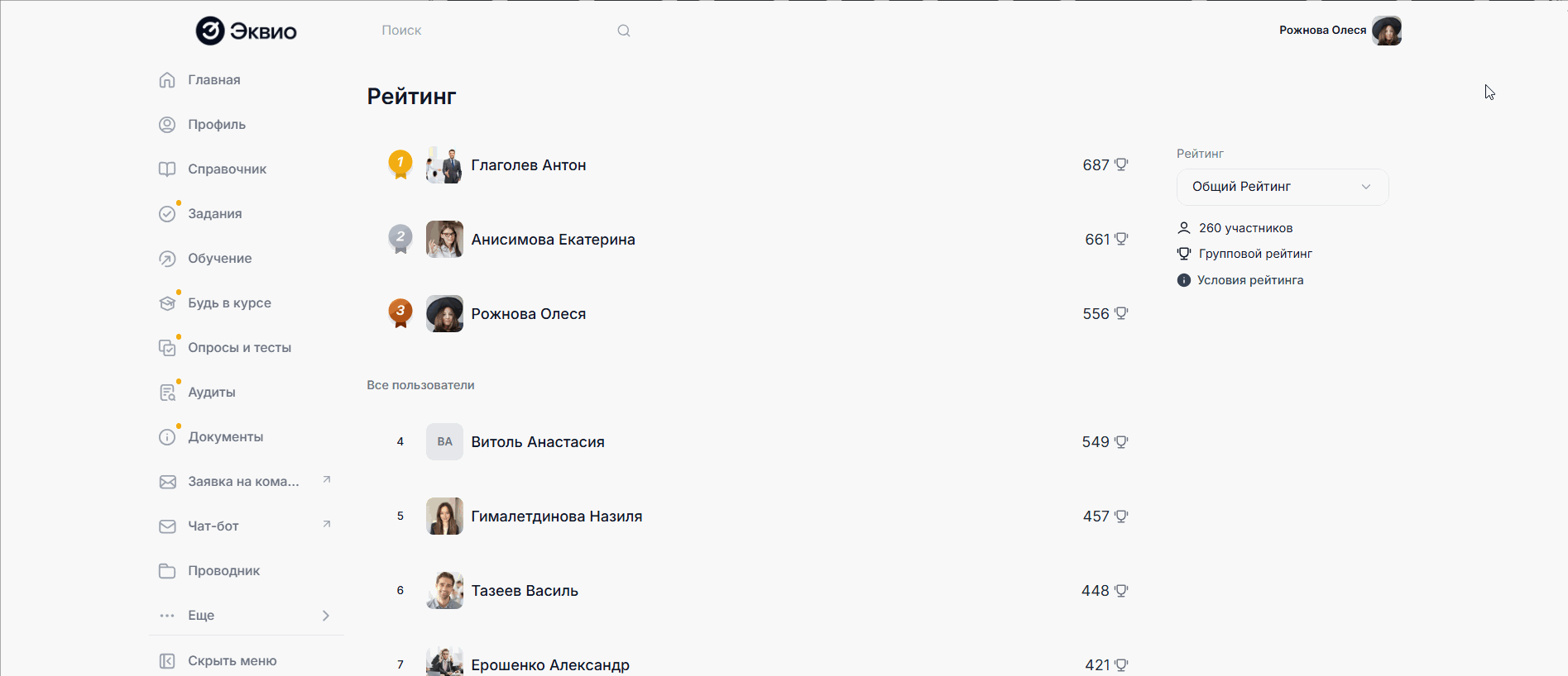 Рейтинг позволяет пользователю видеть свои результаты, сравнивать их с другими участниками и отслеживать прогресс. В разделе Достижения доступны все рейтинги, к которым у пользователя есть доступ, а также информация об их правилах и участниках.